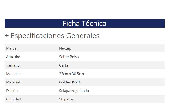 Availability: Out of StockSobre bolsa Nextep Economico NE-016C Tamaño carta solapa engomada paquete con 50 piezas 23cm x 30.5 cm